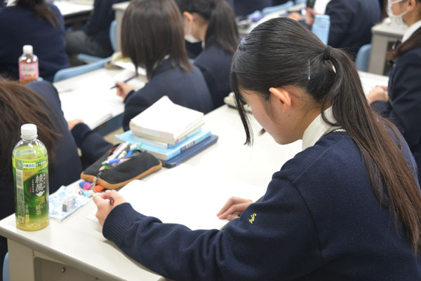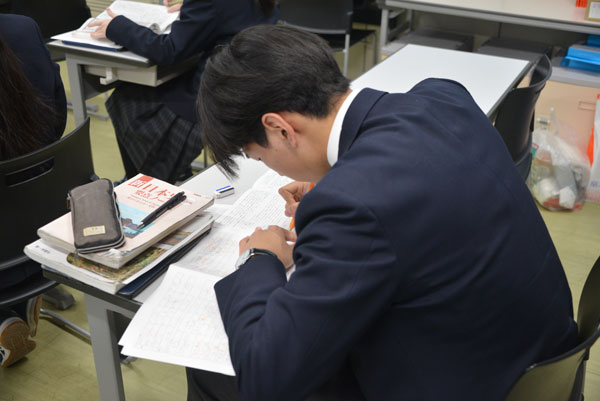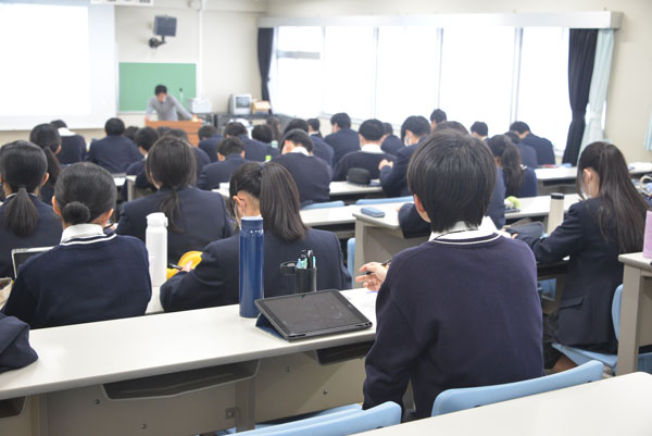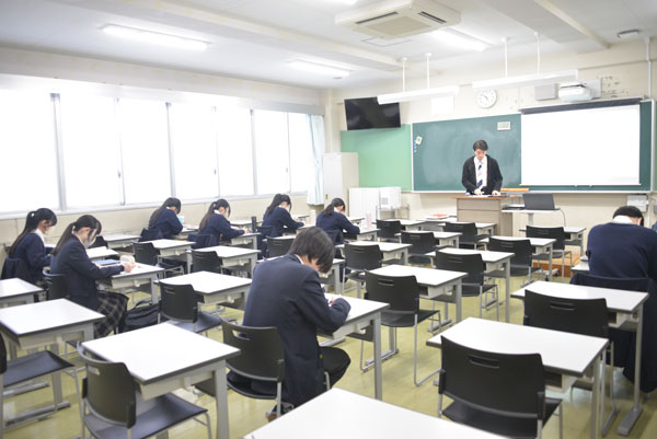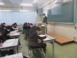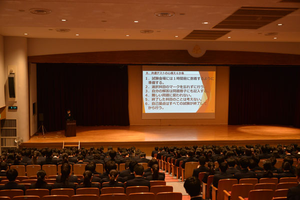 期末試験が終わり、2年生は小論文ガイダンスを記念館ホールにて実施。3年生はホームルームで、年明けの大学入試一般受験に向けたスケジュール作成や出願までの流れを確認、受験までの特別講座、冬期講座の時間割、そして、対策教材が配布されました。