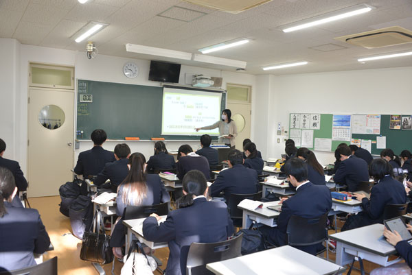 今年の1年生には一人一台のiPad端末が配布され、日々のHRや授業、放課後の自習などで、教員も生徒も様々な形で活用が始まりました。今年度から新学習指導要領には情報活用能力を学習の基盤となる資質・能力の一つとして位置付けられ、観点別の評価方法も導入されます。本校では、授業支援アプリとしてMetaMojiClassRoomを活用していきます。様々な形のデジタルプリントを生徒へ配布、生徒はここにデジタルノートとして書き込むことで、先生は常に学習状況をモニタリングや採点・確認し把握できます。生徒のより主体的な活動が促進できます。小テストやグループワーク、プレゼンテーションなど、様々な方法で応用できるので、ほぼ全教科で活用がすすんでいます。従来の形とICTツールを組み合わせた新しい形の授業づくりが始まりました。
