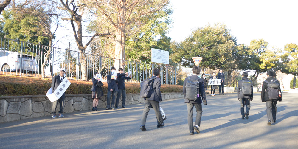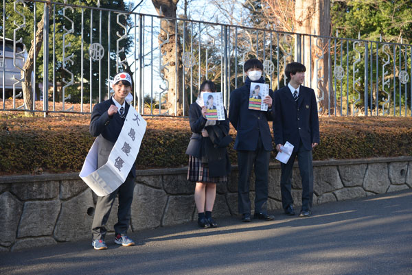 2月14日(土)に実施される生徒会役員選挙に向けて、各役職立候補者の挨拶運動。応援者も一緒に朝早くから明るい挨拶とともに頑張っています。握りしめた拳が気合い十分ですね。