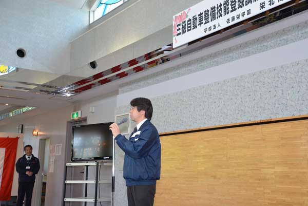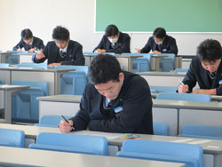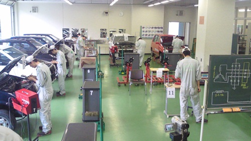 で、自動車実習の3年生の教程末試験の様子です。非常に多くの項目をクリアしなければなりません。3年生は、実車整備です、電気系統も試験が課されます。黒板に書いてある回路図は、間違い探しです。異常回路を探し当てるという試験ですので回路図と電気の流れを読まなければなりません。正確さと作業時間が測定されます。普段から慣れておかないとうまくいきませんので皆真剣です。技術は、教科書を読んでいるだけでは身につかないので、何度も繰り返して経験を積んで技術力を向上させていきます。