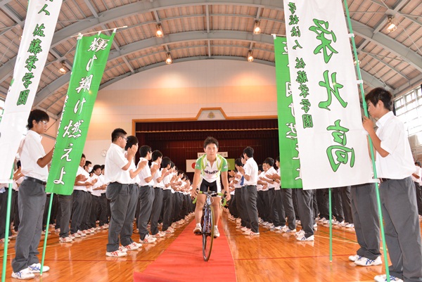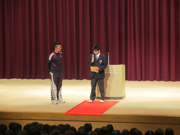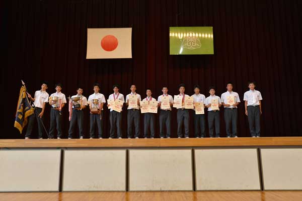この夏、全国大会に出場を決めた部活動、自転車競技部、エア・ライフル部、空手道部、ダンス部の代表選手を激励する壮行会が本日体育館にて