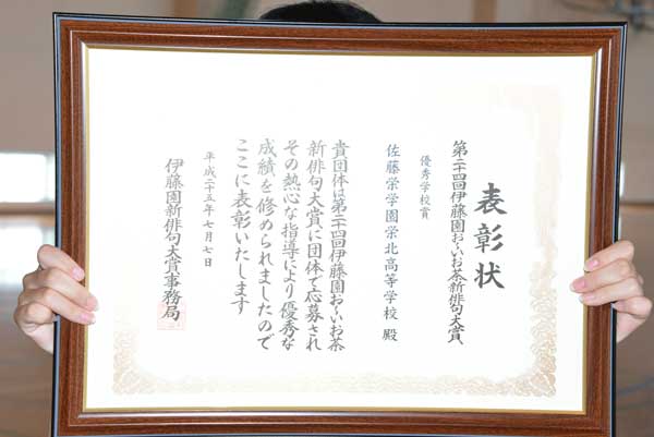 今年2月に第24回伊藤園「おーいお茶新俳句大賞」に学校で団体応募した中から、佳作特別賞に5名、佳作に3名の計8名の生徒が入賞、入選しました。