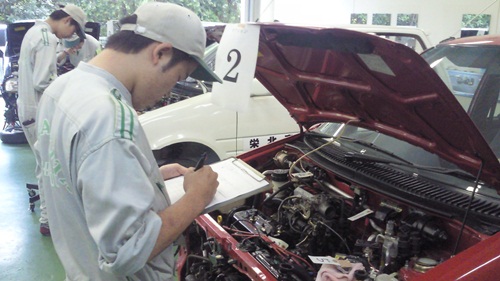 今回は、自動車科からの写真が届きましたのでご紹介いたします。栄北高校の自動車科では、3級自動車整備士100%合格をめざして、全生徒が全力で取り組んでいますが、ただ単純に試験に合格すればよいということではなく、資格を取得するということは、お客さんの車を整備して、安全に運行が出来るように点検・修理を行えることが前提になります。つまり、自分が行った整備によってお客さんの命をお預かりするということになり、大きな責任がかかってくるわけで。授業では、そのようなプロ意識を自覚させることも重要になります。まずは、自分のことをしっかり管理することから始まり、相手のことを考えて行動すること。皆、車に対する思いは人一倍ですから、車を運転する皆に安心して乗ってもらえるよう日々努力です。